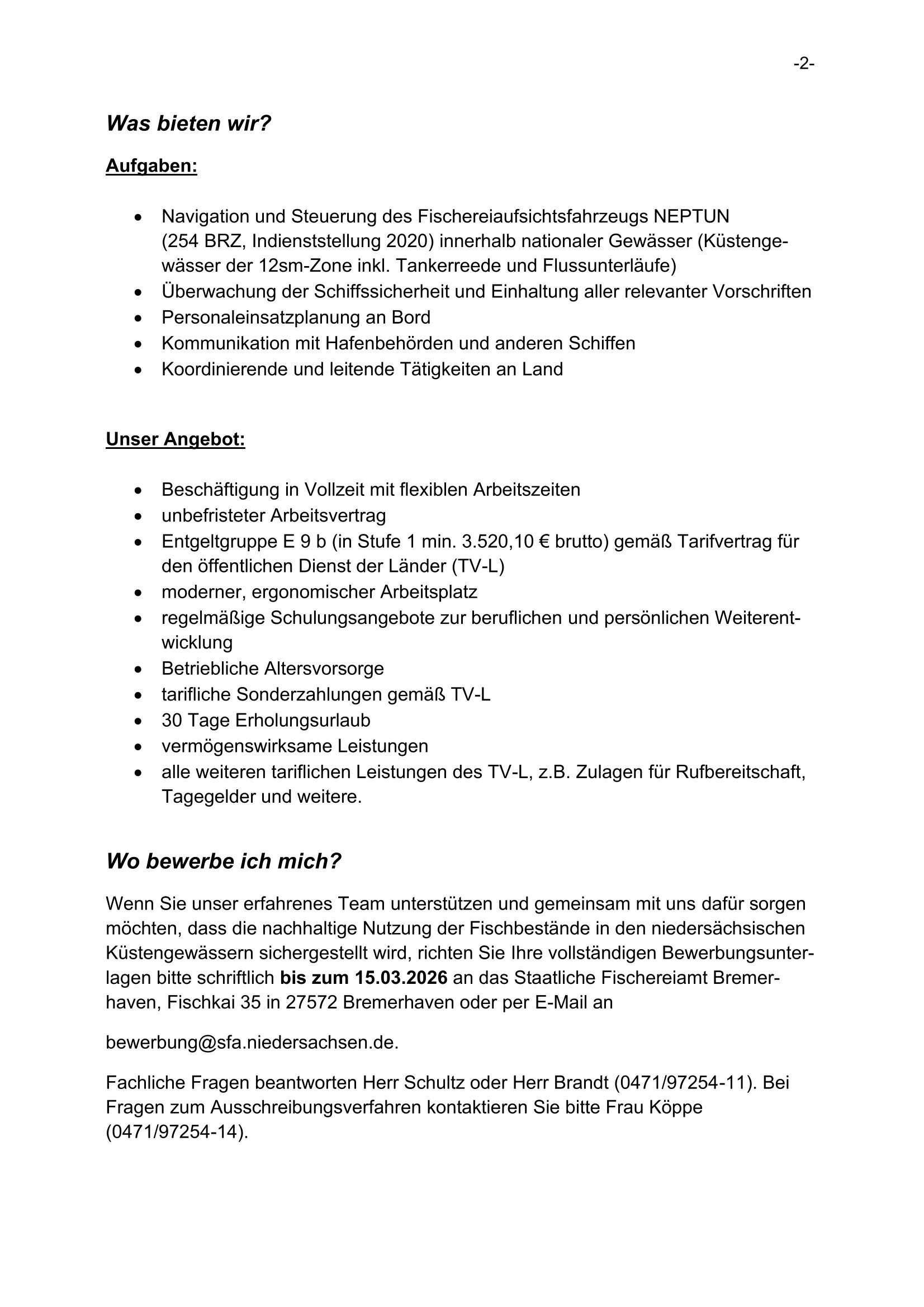 Stellenausschreibung Kapitän/in (m/w/d) für das Fischereiaufsichtsfahrzeug NEPTUN am Standort Cuxhaven